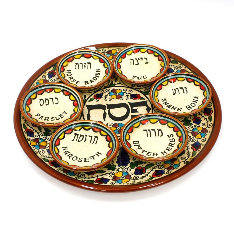 This fantastic ceramic Seder plate will add a touch of regal splendor to your Seder table! It features classic Armenian colorful floral designs throughout, as well as separate bowls for each of the Seder items, with the name of the item in Hebrew and English on each one. The center of the main plate has the word Pesach in Hebrew.