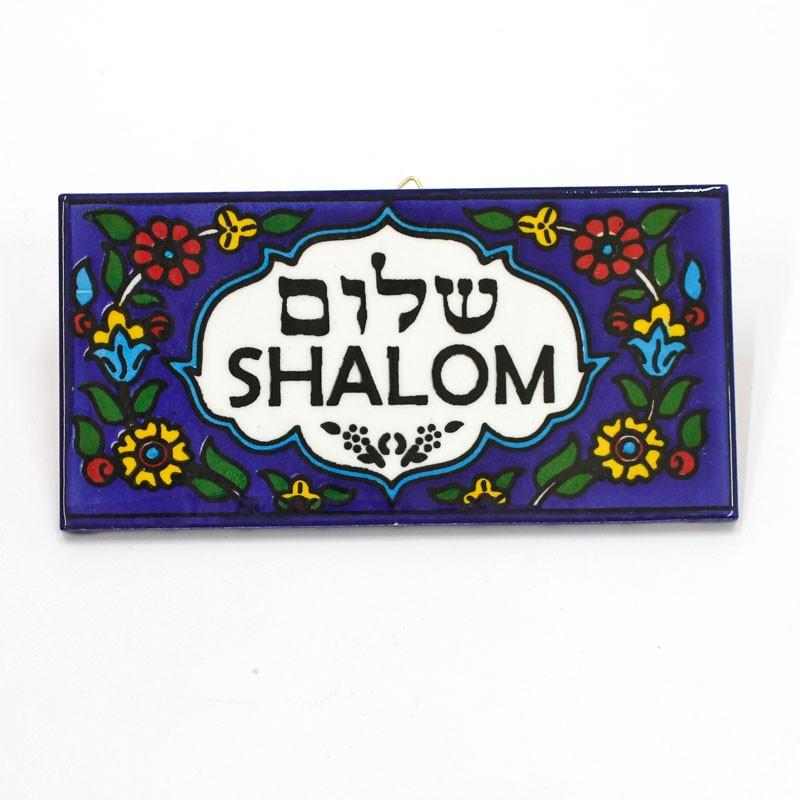 This eye catching glazed ceramic wall tile, hand painted in bold and bright colors. Surrounded by a classic Armenian colorful floral patterns are the words Shalom (peace) in Hebrew and English.