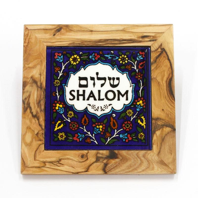 This stunning glazed ceramic wall tile is hand painted in vibrant colors. Surrounded by classic Armenian colorful floral patterns are the words Shalom (peace) in Hebrew and English. It is framed in a beautiful hand made olive wood border