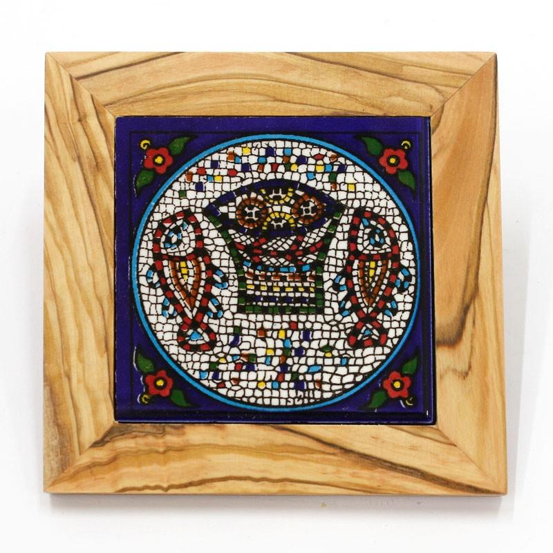 This stunning glazed ceramic wall tile is hand painted in vibrant colors and features the famous Tabgha mosaic as seen at the Sea of Galilee. It is framed in a beautiful hand made olive wood border. This gorgeous tile will add a touch of classic beauty to any wall it adorns or can be used as a coaster or pot stand.