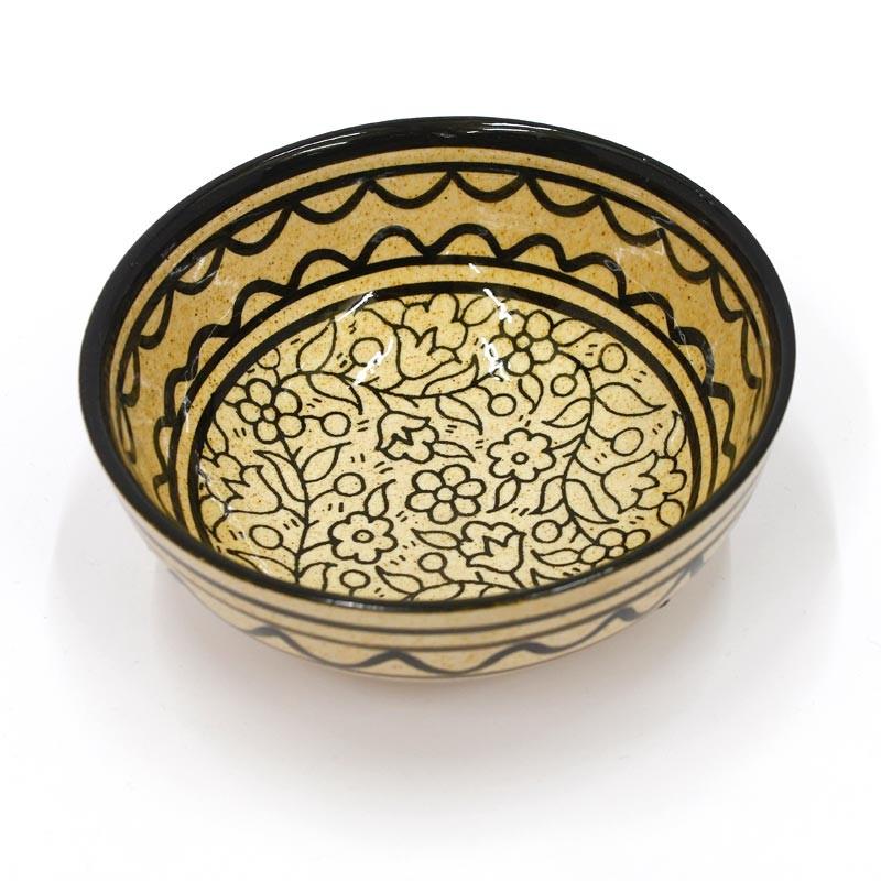 This beautiful small ceramic sauce bowl is hand painted in an artistic black and beige floral design. It makes a stunning and useful addition to your kitchen collection.