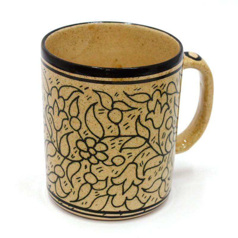 This classy yet robust ceramic mug with a floral design hand painted in black on a beige background makes a beautiful gift for daily use at home or in the office.