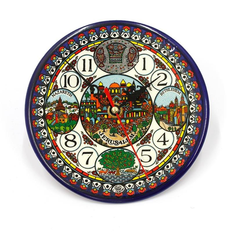 This stunning and eye catching ceramic wall clock is hand painted in beautiful vibrant colors featuring designs of Nazareth, Bethlehem, Jerusalem, the famous Tabgha mosaic at the Sea of Galilee and the renowned olive tree. It is a timely reminder of this amazing Land and all it signifies.