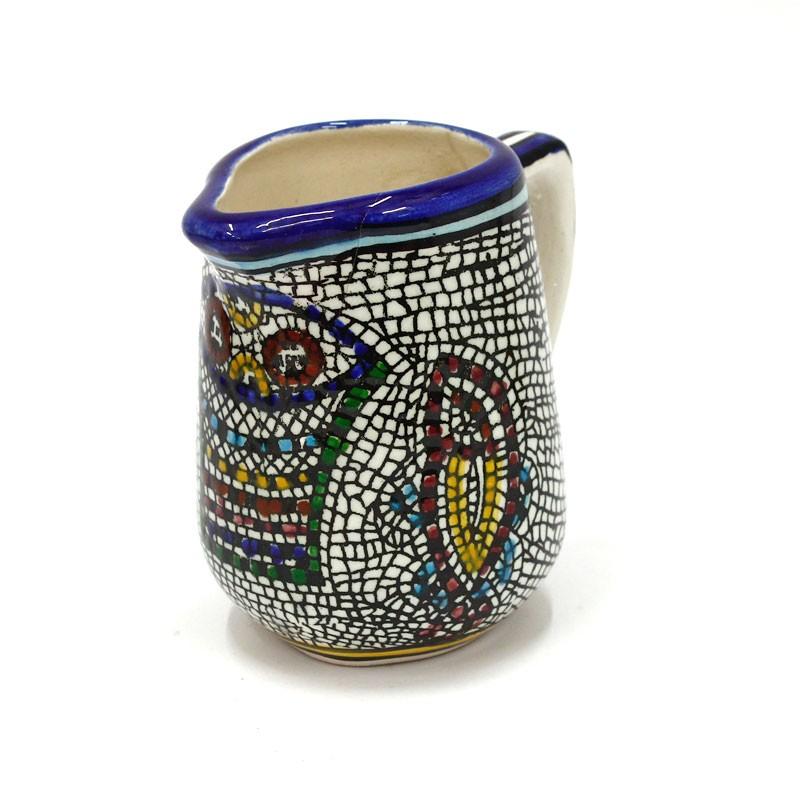 This mini ceramic jug is hand painted in vibrant colors featuring the famous Tabgha mosaic as seen at the Sea of Galilee. It’s the perfect size for an individual serving of milk, cream or sauce. Its robust nature means it can be used on a daily basis or can be displayed as a delightful ornament.