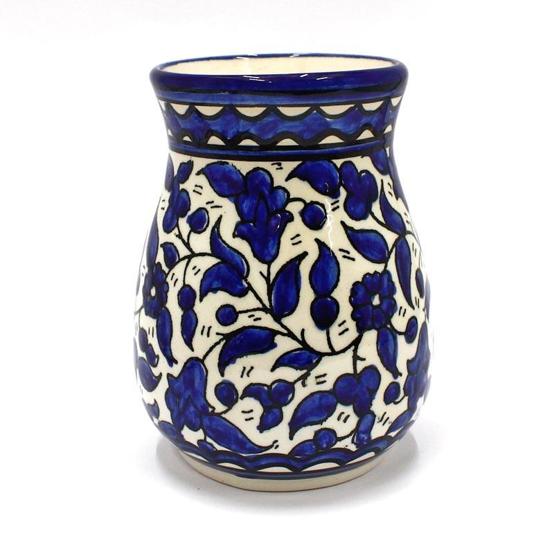 This beautiful ceramic vase is hand painted in bold and bright blue and white colors to create a lovely floral design. It makes a delightful ornament for your home.