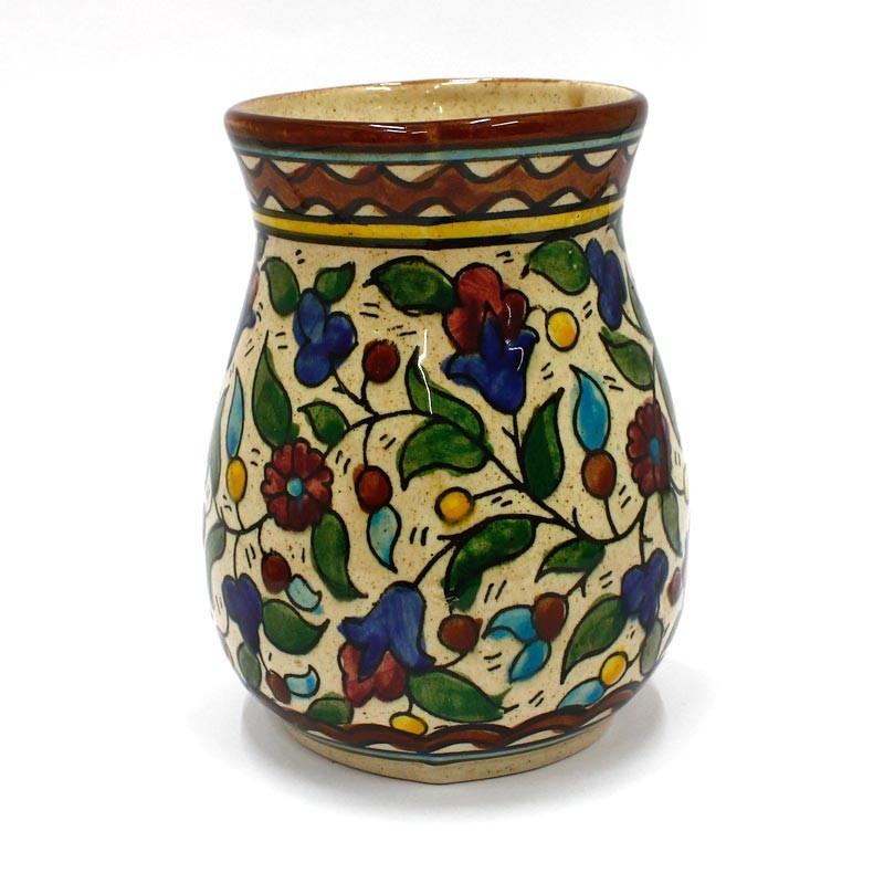 This beautiful ceramic vase is hand painted in bold and bright colors to create a lovely floral design. It makes a delightful ornament for your home.