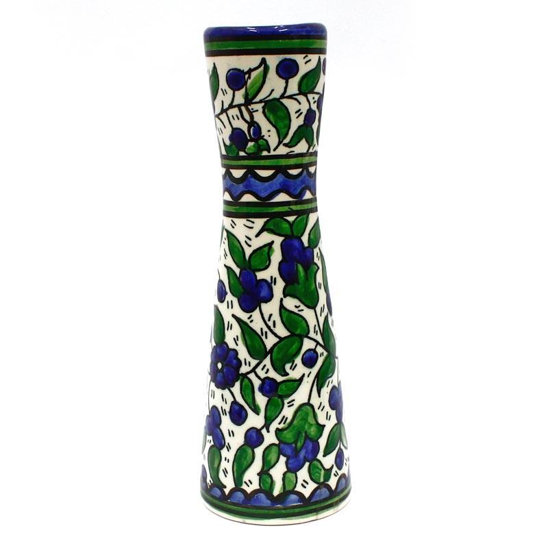 This beautiful ceramic vase is hand painted in bold and bright blue and green colors to create a stunning floral design. It makes a delightful ornament for your home.