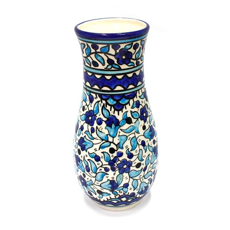 This beautiful ceramic vase is hand painted in two bold and bright shades of blue to create a lovely floral design. It makes a delightful ornament for your home.