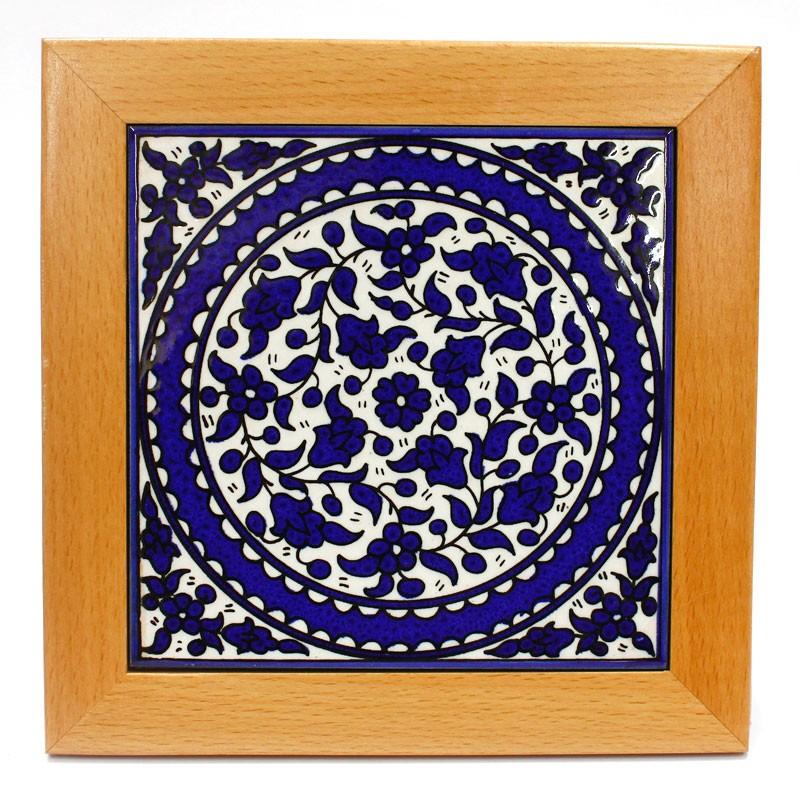 This stunning glazed ceramic wall tile is hand painted in bold blue and white featuring a beautiful Armenian floral design. It is framed in a beautiful hand made olive wood border. This gorgeous tile will add a touch of classic beauty to any wall it adorns or can be used as a coaster or pot stand.