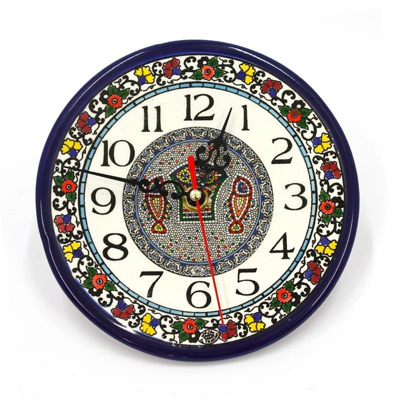 This stunning and eye catching ceramic clock is hand painted in vibrant colors featuring a beautiful and intricate floral design around the edge while the center features the famous Tabgha mosaic fro the Sea of Galilee. It is a timely reminder of the miracle of the loaves and fish!