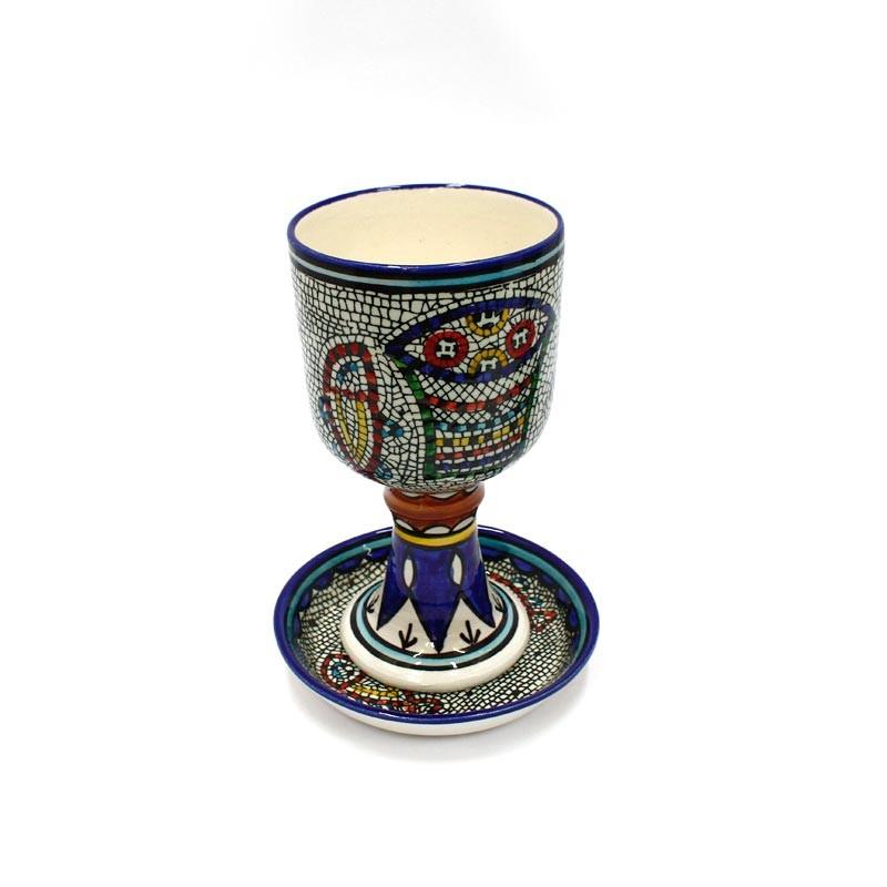 This stunning ceramic wine cup and plate set is hand painted in bold and bright colors depicting the famous Tabgha mosaic from the Sea of Galilee. Not only is it a beautiful addition to your home, but also a timely reminder of the miracles of Jesus.