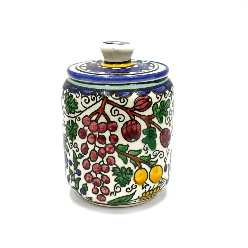 This beautiful ceramic, storage jar is hand painted in bold, bright colors and depicts the Seven species of Israel. It makes a stunning and practical addition to your home as well as a reminder of the rich agricultural production of this awesome Land.