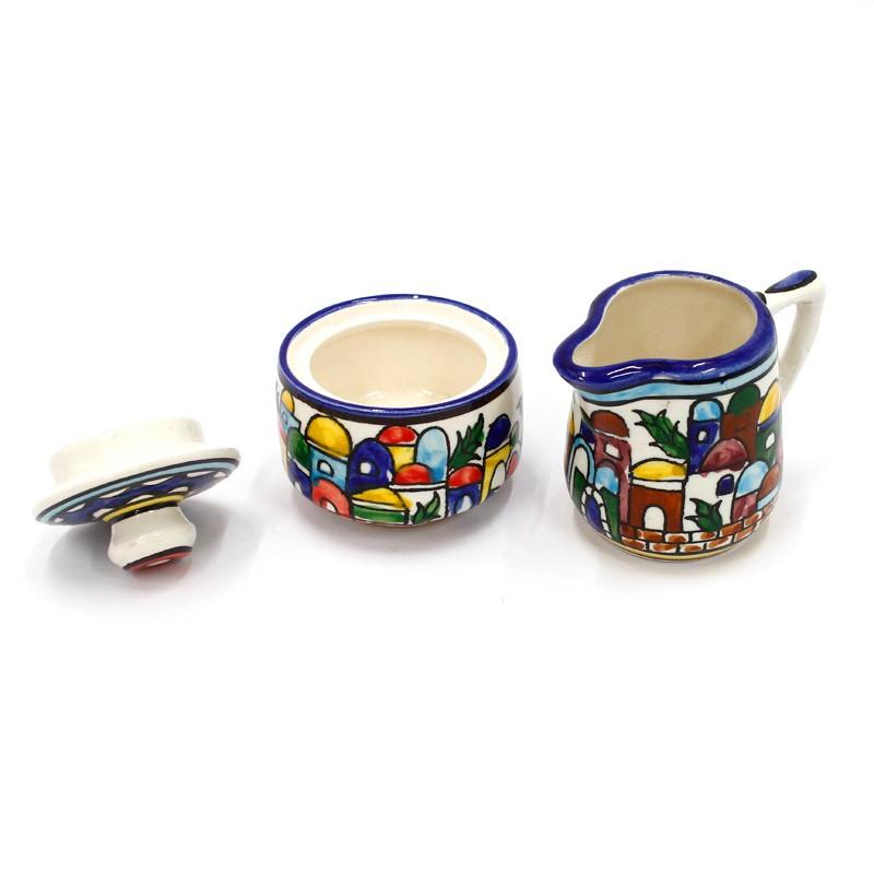 This charming set of sugar bowl and milk jug, hand painted in bold, bright colors depicting a design of Jerusalem, will make a beautiful and practical addition to your home.