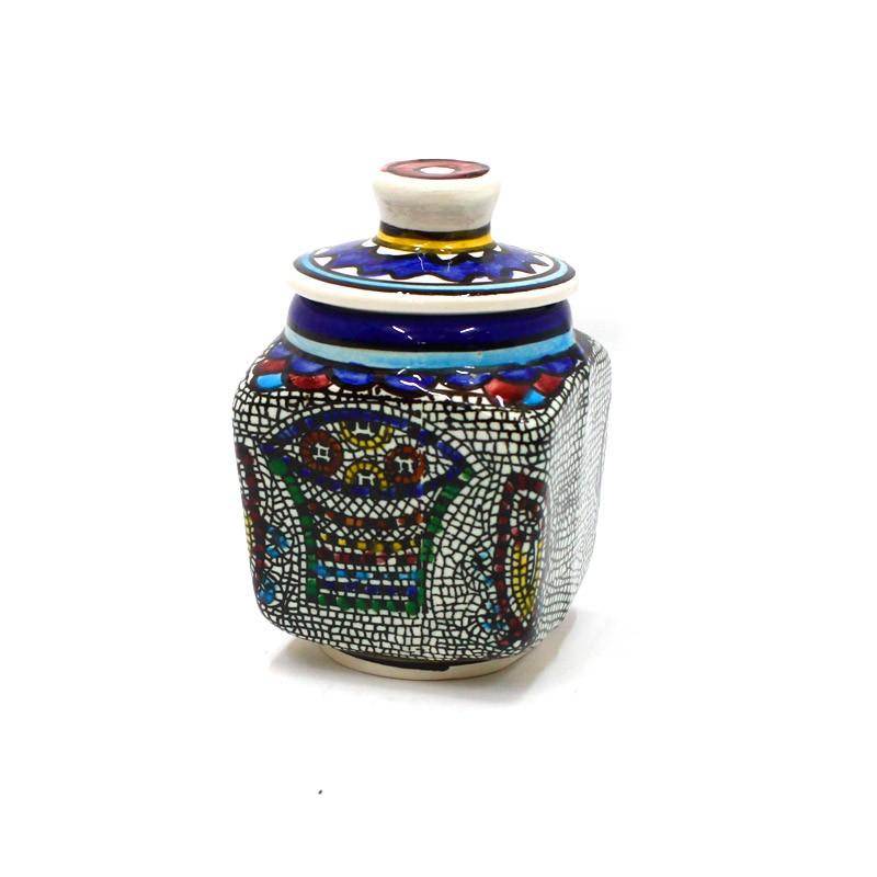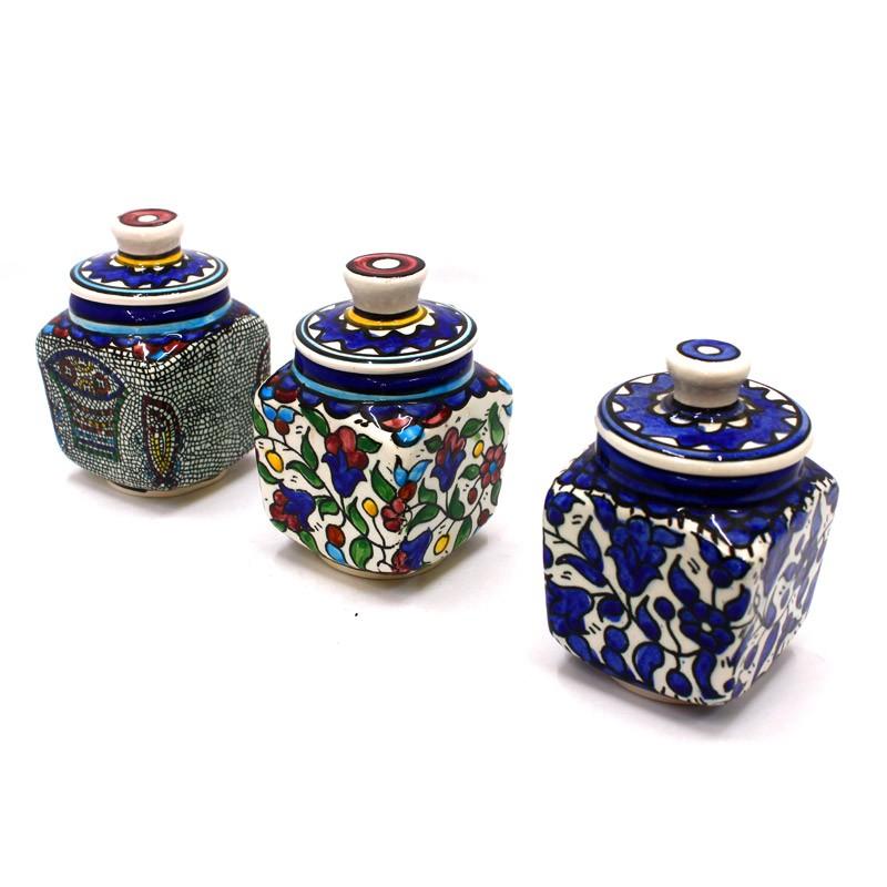 This beautiful set of three ceramic jars, hand painted in bold, bright colors display two different floral designs and the famous Tabgha mosaic design.