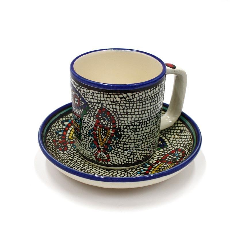 This cute little cup with saucer set is hand painted in vibrant colors depicting the famous Tabgha mosaic at the Sea of Galilee. They are both practical and pretty and will make an eye catching addition to your home.