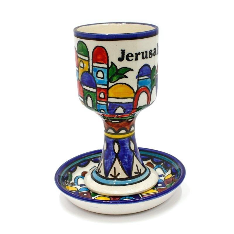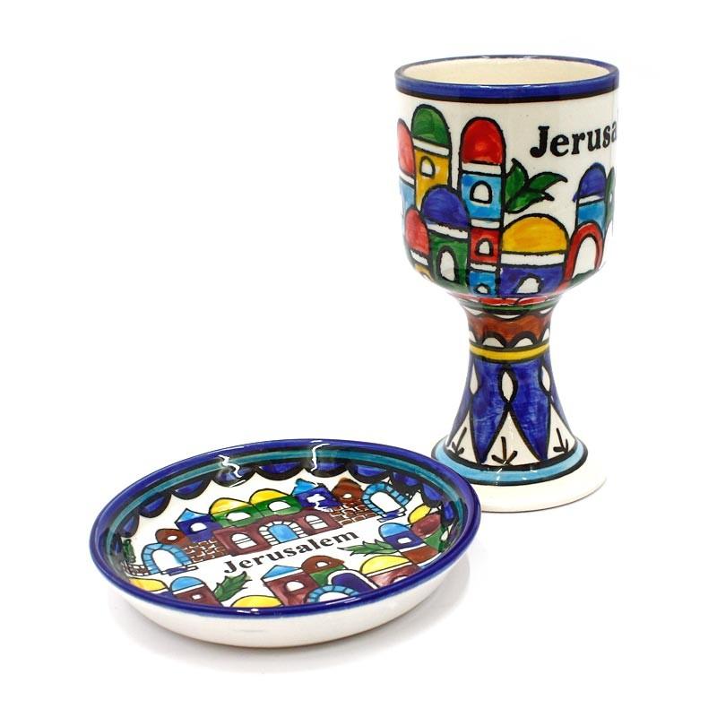 This beautiful set comprising a ceramic wine glass and plate, hand painted in bold, bright colors depicting the City of Jerusalem, will make a stunning and practical addition to your home and a timely reminder of this awesome city.