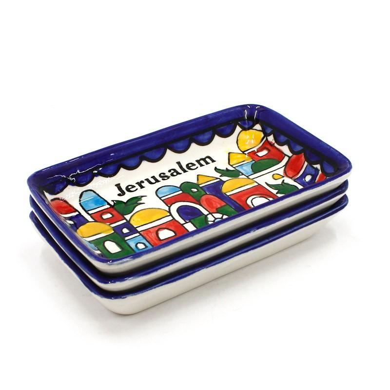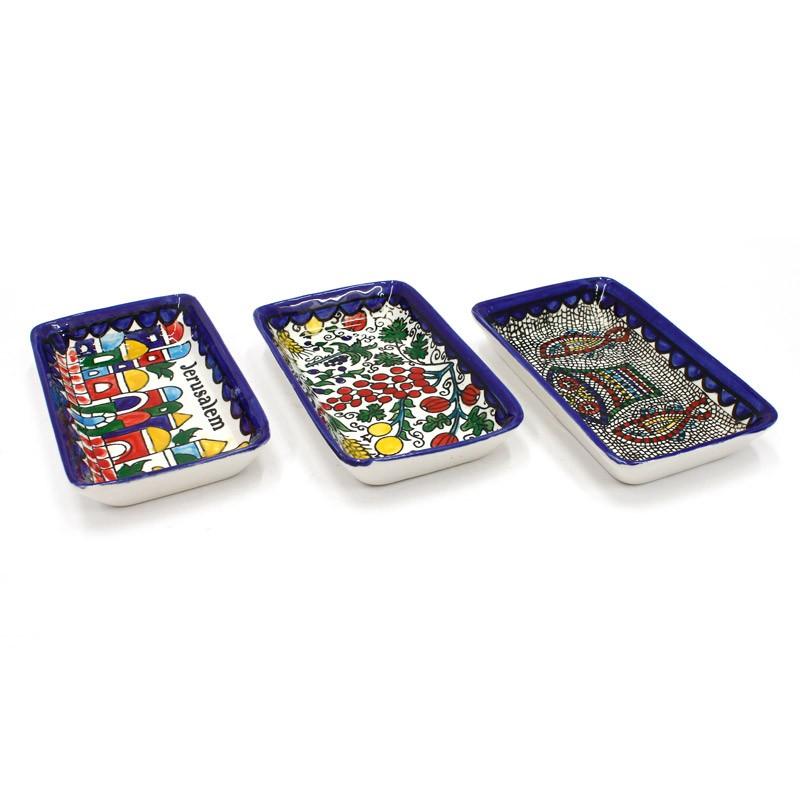 This beautiful set of serving dishes will make a stunning and practical addition to your home. Hand painted in bold, bright colors, they portray the city of Jerusalem, the Seven Species of Israel and the famous Tabgha mosaic of the loaves and fish miracle.
