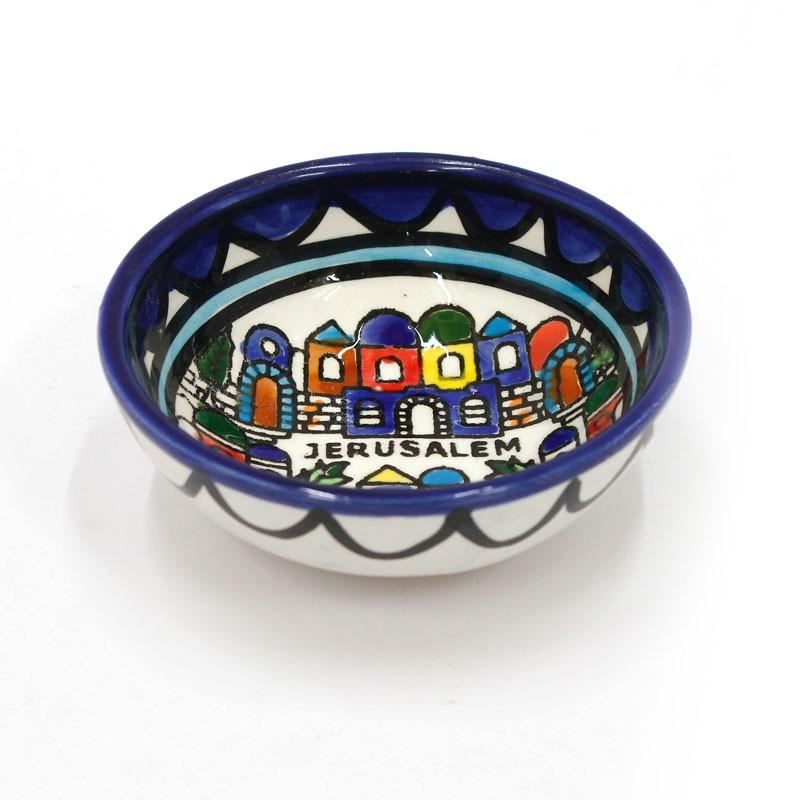 This mini ceramic bowl is hand painted in vibrant colors featuring a design of Jerusalem. Robust and practical, it makes a great addition to your kitchen crockery and a timely reminder of this awesome city.