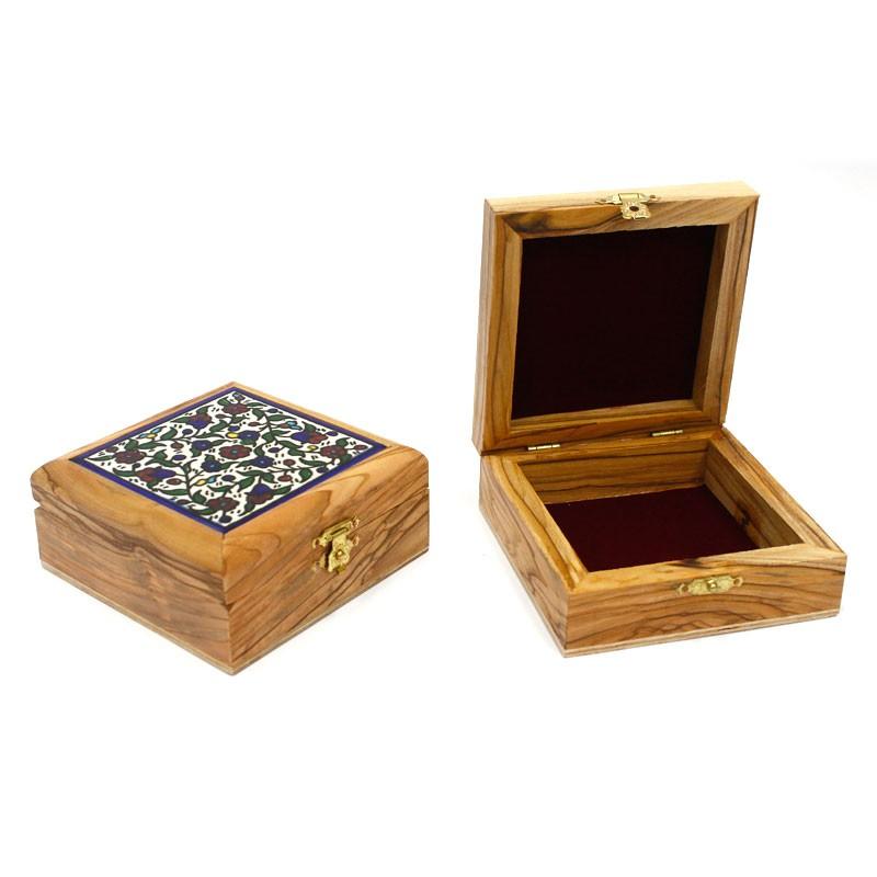 This charming jewelry box is hand made in Bethlehem from the finest olive wood. The top is inlaid with a ceramic tile hand painted in vibrant colors and featuring a beautiful Armenian floral design. It is perfect for storing jewelry or small knickknacks of any kind. The sturdy yet elegant construction makes it perfect for both display and travel. The bottom of the box, as well as the inner bottom surface, are lined with felt.