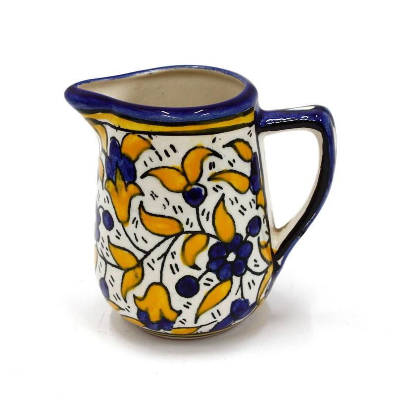 This mini ceramic jug is hand painted in vibrant colors of blue and yellow to give a pretty floral design. It’s the perfect size for an individual serving of milk, cream or sauce. Its robust nature means it can be used on a daily basis or can be displayed as a delightful ornament.