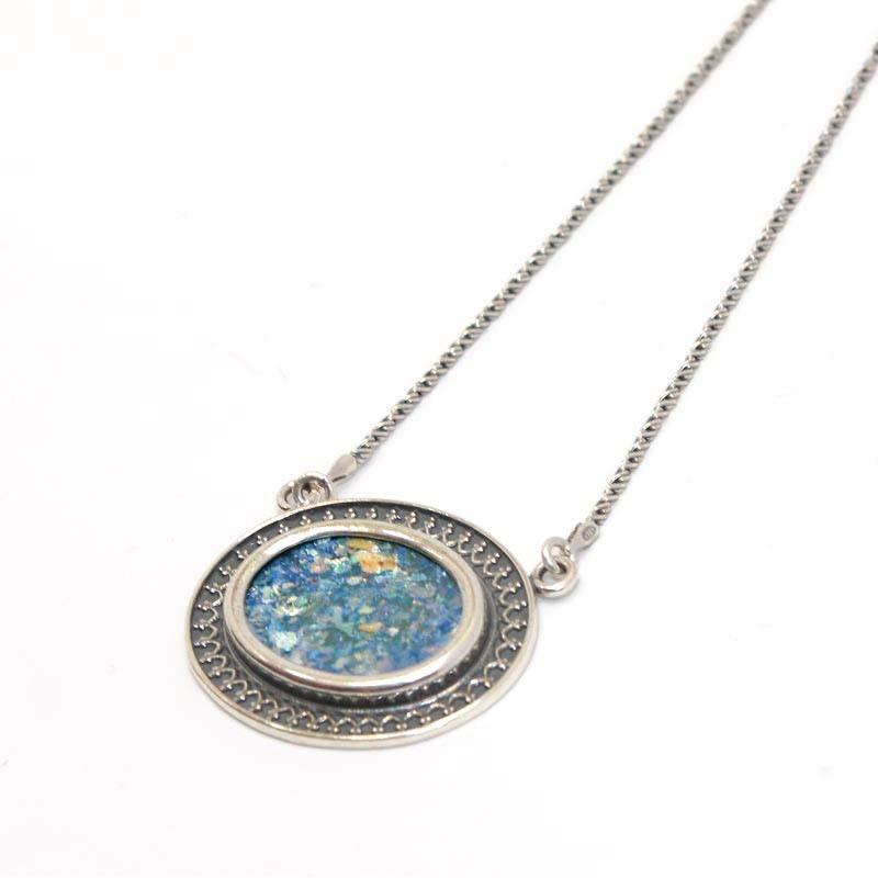 The Sterling Silver, into which the fragments of genuine Roman glass are inlaid, compliments the glimmer of sand and other compounds that were fused together into this exclusive piece of history.