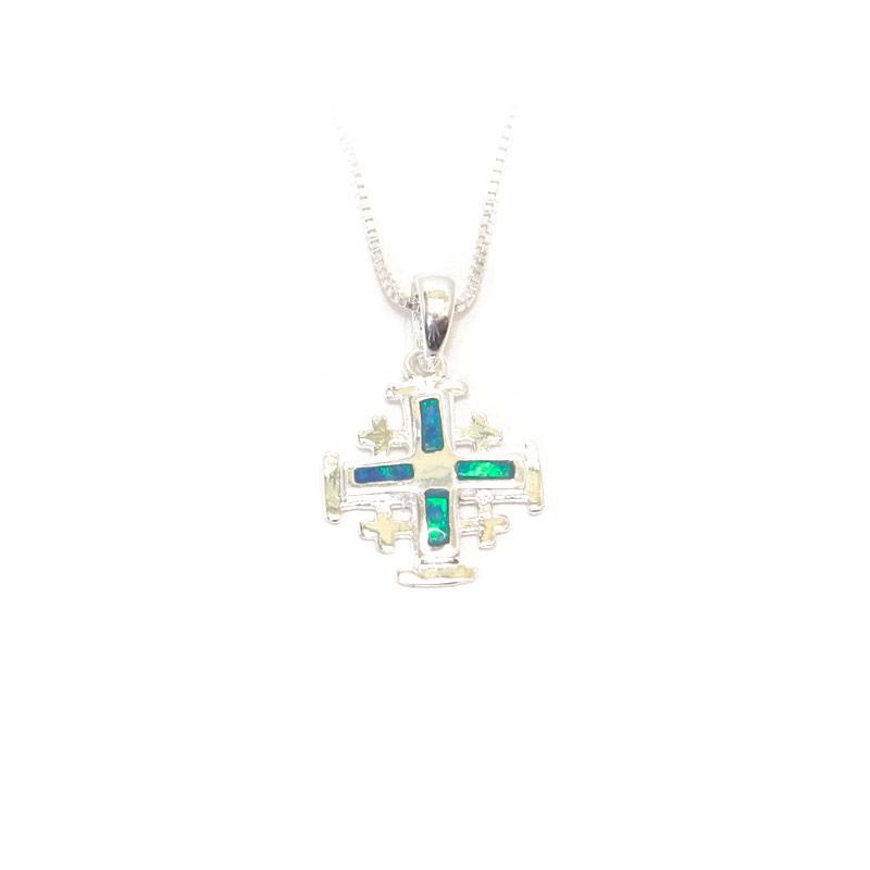 Sterling Silver Jerusalem Cross Pendant With Opal Stones